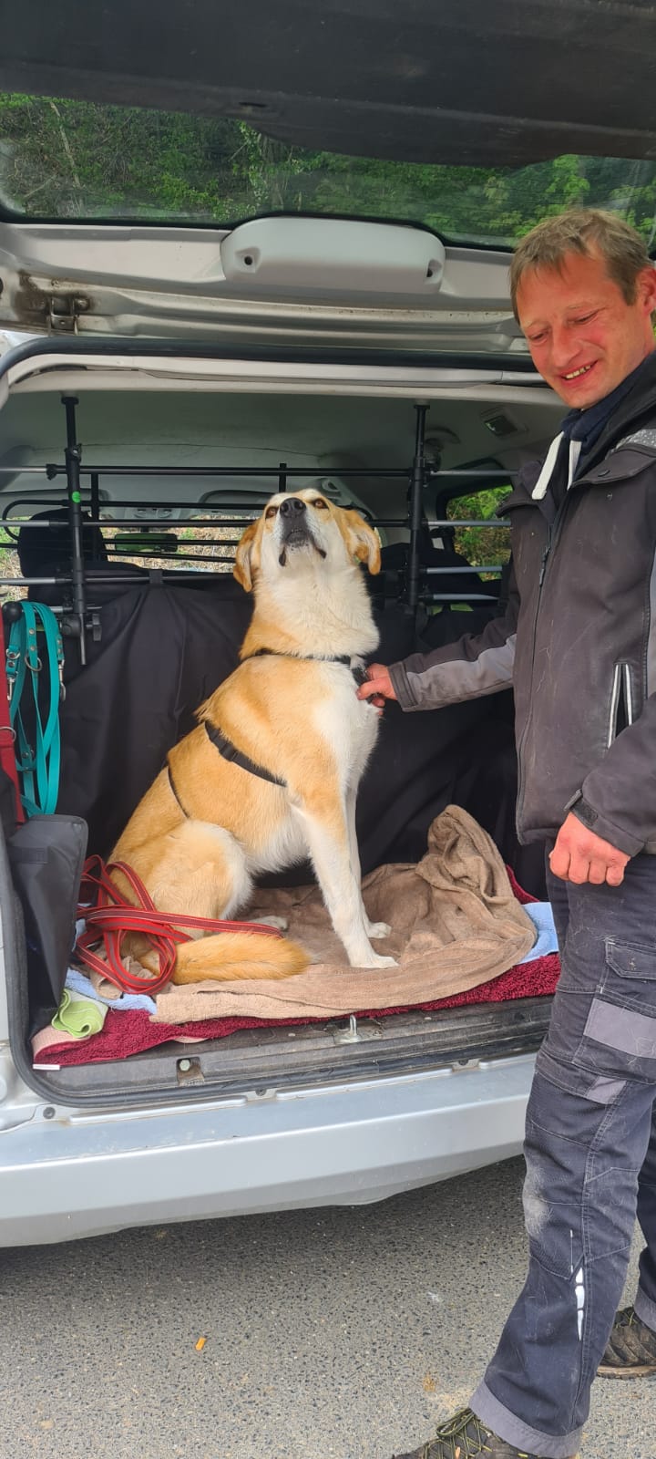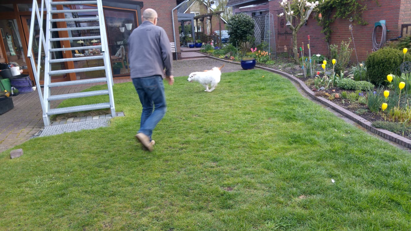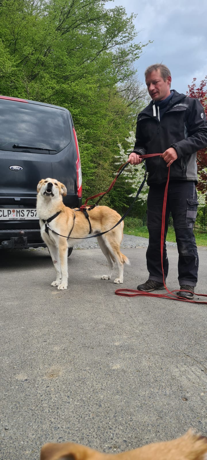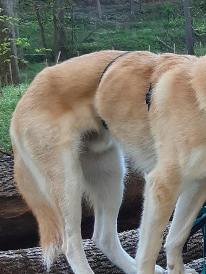 Jetzt ist der Bub seit 2 Wochen da und hat sich relativ gut eingelebt. Er wird von Tag zu Tag sicherer. Eigentlich wollte ich nach der Eingewöhnung recht zügig anfangen mit ihm zu trainieren um ihn auf den Wesenstest vorzubereiten. Ich hatte einen stattlichen jungen Burschen von ca 40 Kilo erwartet. Übernommen habe ich: ein Klappergestell ! Mir war direkt klar, dass er wohl nicht ganz fit ist.